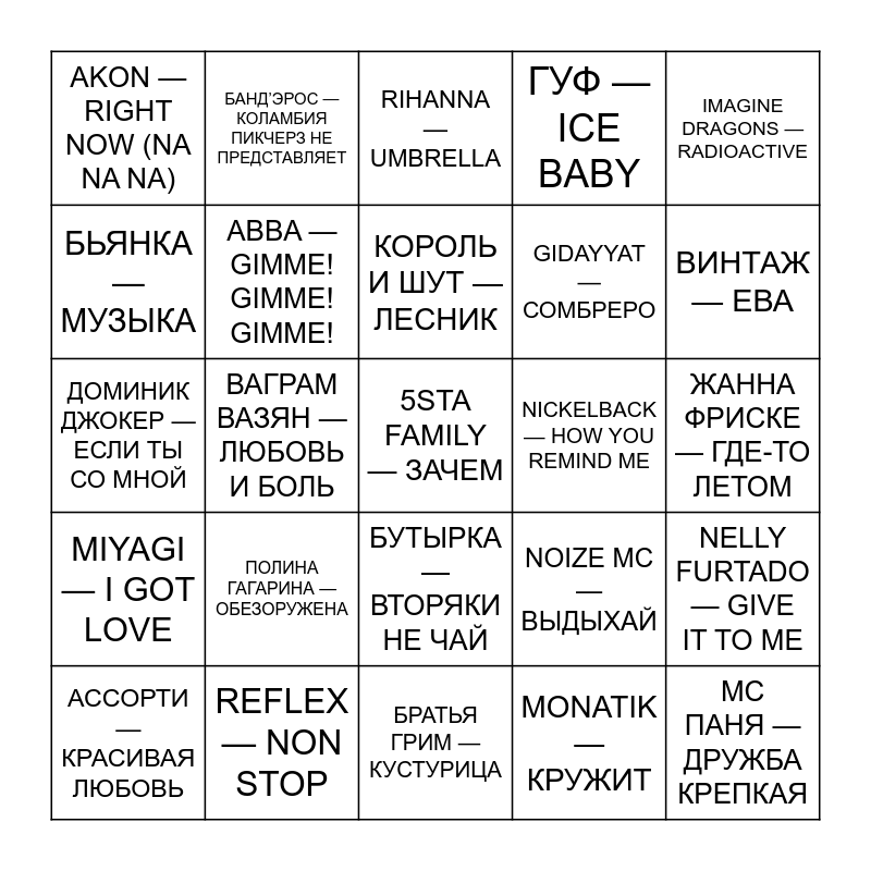 This bingo card has 50 words: ВЕРКА СЕРДЮЧКА — Я НЕ ПОНЯЛА, 5STA FAMILY — ЗАЧЕМ, НЮША — ЦУНАМИ, БРАТЬЯ ГРИМ — КУСТУРИЦА, ПОЛИНА ГАГАРИНА — ОБЕЗОРУЖЕНА, ИГОРЬ КОРНЕЛЮК — ГОРОД, КОТОРОГО НЕТ, БАНД’ЭРОС — КОЛАМБИЯ ПИКЧЕРЗ НЕ ПРЕДСТАВЛЯЕТ, ТИМАТИ — НЕ СХОДИ С УМА, БЬЯНКА — МУЗЫКА, SEREBRO — ПЕРЕПУТАЛА, ABBA — GIMME! GIMME! GIMME!, ГУФ — ICE BABY, NELLY FURTADO — GIVE IT TO ME, NOIZE MC — ВЫДЫХАЙ, MAROON 5 — SUGAR, THE BLACK EYED PEAS — MY HUMPS, КОРОЛЬ И ШУТ — ЛЕСНИК, NICKELBACK — HOW YOU REMIND ME, ГРИГОРИЙ ЛЕПС — Я ПОДНИМАЮ РУКИ, IMAGINE DRAGONS — RADIOACTIVE, ВАГРАМ ВАЗЯН — ЛЮБОВЬ И БОЛЬ, MONATIK — КРУЖИТ, AKON — RIGHT NOW (NA NA NA), GIDAYYAT — СОМБРЕРО, ВИТАС — ОПЕРА #2, МС ПАНЯ — ДРУЖБА КРЕПКАЯ, ВИНТАЖ — ЕВА, НЕПАРА — ПЛАЧЬ И СМОТРИ, RIHANNA — UMBRELLA, БУТЫРКА — ВТОРЯКИ НЕ ЧАЙ, ROBBIE WILLIAMS — FEEL, MACAN — ASPHALT 8, СОФИЯ РОТАРУ — Я НАЗОВУ ПЛАНЕТУ, СЕРГЕЙ ЛАЗАРЕВ — В САМОЕ СЕРДЦЕ, REFLEX — NON STOP, DAN BALAN — CHICA BOMB, СКРИПТОНИТ — ПОЛОЖЕНИЕ, АЛЁНА СВИРИДОВА — РОЗОВЫЙ ФЛАМИНГО, INNA — HOT, ЖАННА ФРИСКЕ — ГДЕ-ТО ЛЕТОМ, ФИЛИПП КИРКОРОВ — Я ЗА ТЕБЯ УМРУ, ВАЛЕРИЯ — ЧАСИКИ, ANNA ASTI — ПО БАРАМ, #2МАШИ — МАМА Я ТАНЦУЮ, АССОРТИ — КРАСИВАЯ ЛЮБОВЬ, ДОМИНИК ДЖОКЕР — ЕСЛИ ТЫ СО МНОЙ, ВИА ГРА — ПОПЫТКА № 5, ATL — ТАНЦУЙТЕ, MIYAGI — I GOT LOVE and ВАЛЕРИЙ МЕЛАДЗЕ — САМБА БЕЛОГО МОТЫЛЬКА.