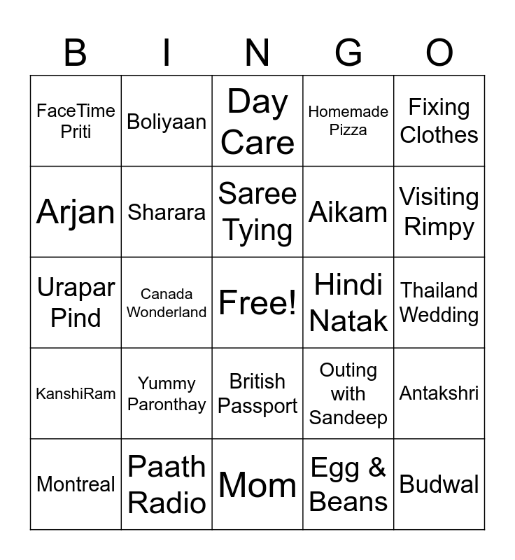 This bingo card has a free space and 32 words: Egg & Beans, Nani, Canada Wonderland, Ram Pyaari, KanshiRam, Sharara, Fixing Clothes, Antakshri, Boliyaan, Toshi, Asha, Sita, Saree Tying, Day Care, Bibi, Neighbor Kitty, Hindi Natak, Working at Bakery, Montreal, Urapar Pind, British Passport, Yummy Paronthay, Outing with Sandeep, Mexico Wedding, Thailand Wedding, Paath Radio, Budwal, Homemade Pizza, Aikam, Arjan, FaceTime Priti, Mom, Sleepover with Toshi Masi and Visiting Rimpy.