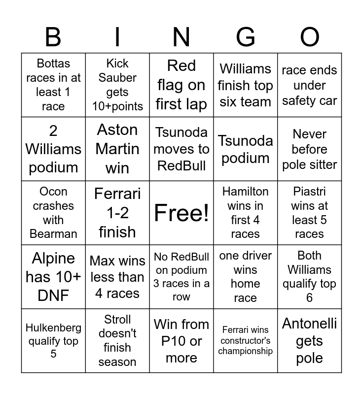 This bingo card has a free space and 24 words: Max wins less than 4 races, Stroll doesn't finish season, Tsunoda moves to RedBull, Hulkenberg qualify top 5, race ends under safety car, Bottas races in at least 1 race, 2 Williams podium, Kick Sauber gets 10+points, Hamilton wins in first 4 races, No RedBull on podium 3 races in a row, Tsunoda podium, Ocon crashes with Bearman, one driver wins home race, Both Williams qualify top 6, Aston Martin win, Ferrari wins constructor's championship, Piastri wins at least 5 races, Red flag on first lap, Never before pole sitter, Ferrari 1-2 finish, Antonelli gets pole, Alpine has 10+ DNF, Williams finish top six team and Win from P10 or more.