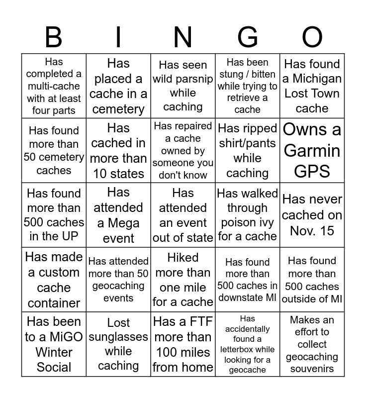 This bingo card has 25 words: Has attended more than 50 geocaching events, Has a FTF more than 100 miles from home, Has repaired a cache owned by someone you don't know, Has been to a MiGO Winter Social, Has found a Michigan Lost Town cache, Has completed a multi-cache with at least four parts, Has found more than 50 cemetery caches, Has placed a cache in a cemetery, Has walked through poison ivy for a cache, Hiked more than one mile for a cache, Has ripped shirt/pants while caching, Has found more than 500 caches in the UP, Has found more than 500 caches in downstate MI, Has found more than 500 caches outside of MI, Has cached in more than 10 states, Makes an effort to collect geocaching souvenirs, Has never cached on Nov. 15, Has seen wild parsnip while caching, Owns a Garmin GPS, Has attended a Mega event, Has attended an event out of state, Lost sunglasses while caching, Has made a custom cache container, Has been stung / bitten while trying to retrieve a cache and Has accidentally found a letterbox while looking for a geocache.