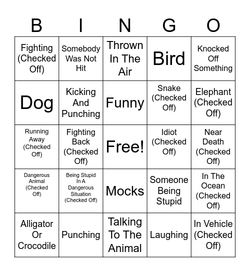 This bingo card has a free space and 29 words: Kicking, Punching, Thrown In The Air, Charging At Somebody (Checked Off), Knocked Off Something, Fighting (Checked Off), Kicking And Punching, Funny, Idiot (Checked Off), In The Ocean (Checked Off), Alligator Or Crocodile, Fighting Back (Checked Off), Laughing, In Vehicle (Checked Off), Running Away (Checked Off), Bear (Checked Off), Talking To The Animal, Someone Being Stupid, Elephant (Checked Off), Dangerous Animal (Checked Off), Being Stupid In A Dangerous Situation (Checked Off), Fish (Checked Off), Snake (Checked Off), Near Death (Checked Off), Dog, Somebody Was Not Hit, Mocks, Bird and Mammals.