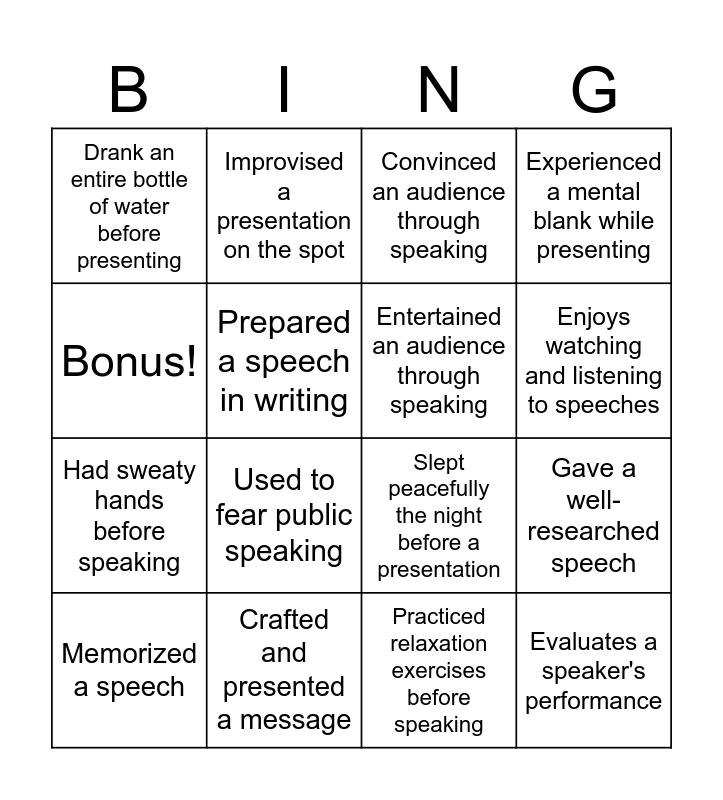 This bingo card has 16 words: Crafted and presented a message, Gave a well-researched speech, Convinced an audience through speaking, Drank an entire bottle of water before presenting, Had sweaty hands before speaking, Improvised a presentation on the spot, Slept peacefully the night before a presentation, Practiced relaxation exercises before speaking, Bonus!, Prepared a speech in writing, Memorized a speech, Experienced a mental blank while presenting, Used to fear public speaking, Enjoys watching and listening to speeches, Entertained an audience through speaking and Evaluates a speaker's performance.