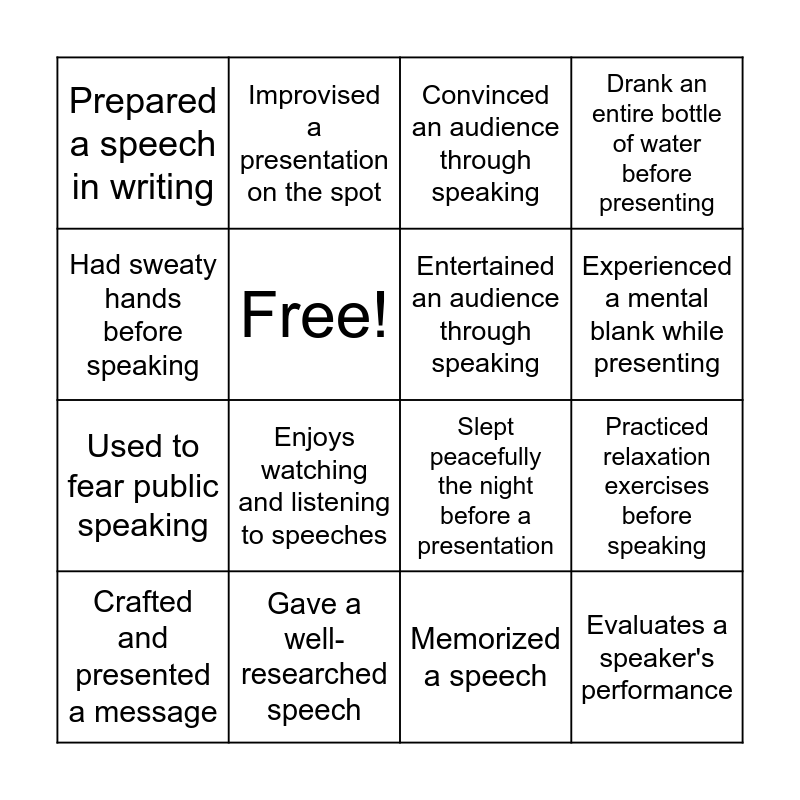This bingo card has 16 words: Crafted and presented a message, Gave a well-researched speech, Convinced an audience through speaking, Drank an entire bottle of water before presenting, Had sweaty hands before speaking, Improvised a presentation on the spot, Slept peacefully the night before a presentation, Practiced relaxation exercises before speaking, Prepared a speech in writing, Free!, Memorized a speech, Experienced a mental blank while presenting, Used to fear public speaking, Enjoys watching and listening to speeches, Entertained an audience through speaking and Evaluates a speaker's performance.