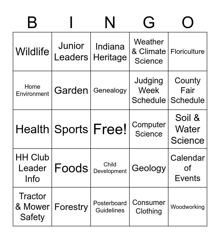 This bingo card has a free space and 49 words: Fashion Revue, Woodworking, Auto/Truck, Posterboard Guidelines, Foods, Communications, Junior Leaders, Entomology, Home Environment, Do Your Own Thing, Garden, Weather & Climate Science, Calendar of Events, Geology, Photography, Cupcake Decorating, Genealogy, Computer Science, Arts & Crafts, Floriculture, Sports, Consumer Clothing, Wildlife, Judging Week Schedule, Electric, County Fair Schedule, Tractor & Mower Safety, Sewing, Child Development, HH Club Leader Info, Cake Decorating, Creating with a mix, Collections, Food Preparation, Forestry, Shooting Sports, Sport fishing, Small Engines, Soil & Water Science, Aerospace, Animal Education, Beekeeping, Crops, Finance, Health, Indiana Heritage, Microwave Cooking, Scrapbook and Veterinary Science.