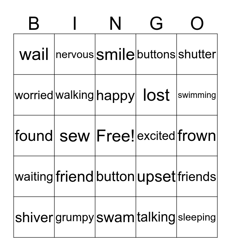This bingo card has a free space and 24 words: friend, grumpy, happy, shiver, shutter, wail, worried, nervous, excited, button, lost, found, upset, friends, walking, talking, frown, smile, swimming, sew, sleeping, waiting, buttons and swam.