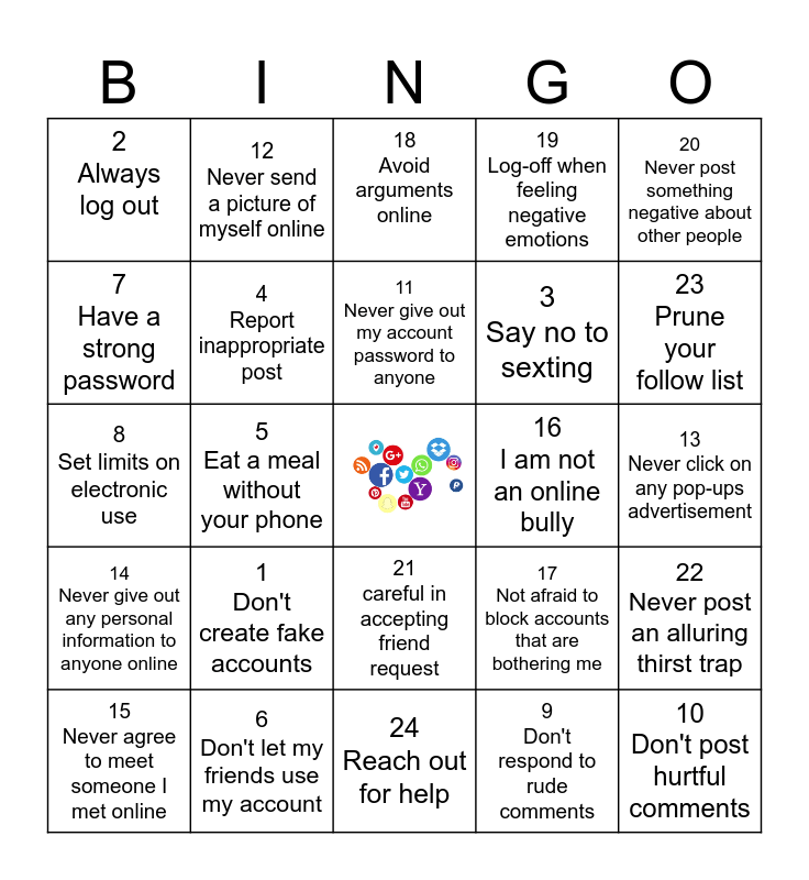 This bingo card has a free space and 24 words: 1 Don't create fake accounts, 6 Don't let my friends use my account, 11 Never give out my account password to anyone, 15 Never agree to meet someone I met online, 20 Never post something negative about other people, 2 Always log out, 7 Have a strong password, 12 Never send a picture of myself online, 16 I am not an online bully, 21 careful in accepting friend request, 3 Say no to sexting, 8 Set limits on electronic use, 17 Not afraid to block accounts that are bothering me, 22 Never post an alluring thirst trap, 4 Report inappropriate post, 9 Don't respond to rude comments, 13 Never click on any pop-ups advertisement, 18 Avoid arguments online, 23 Prune your follow list, 5 Eat a meal without your phone, 10 Don't post hurtful comments, 14 Never give out any personal information to anyone online, 19 Log-off when feeling negative emotions and 24 Reach out for help.