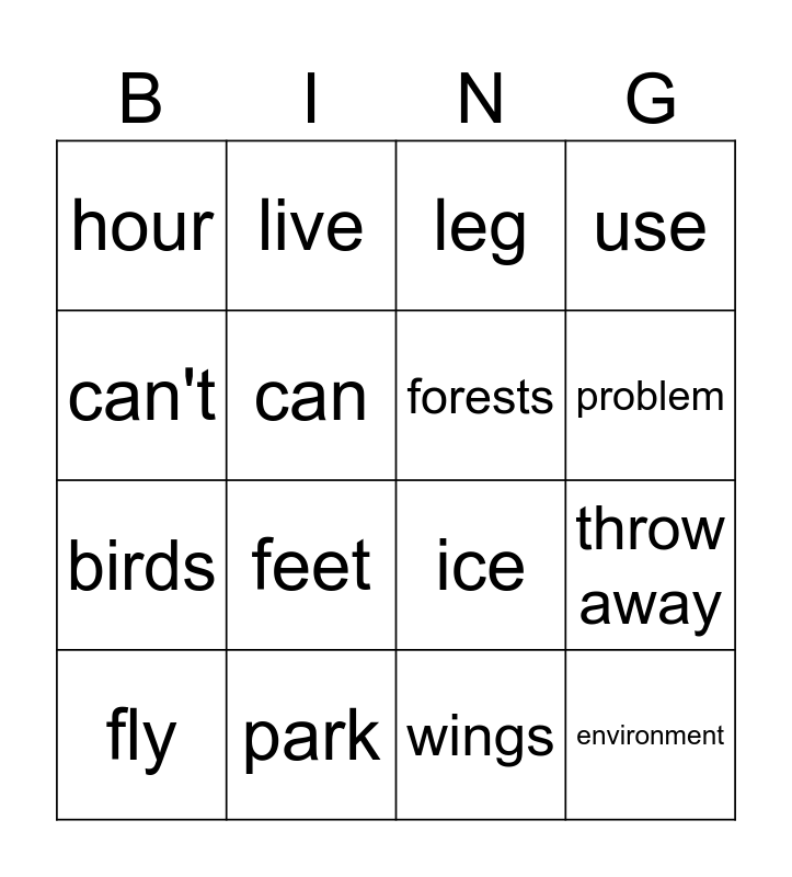 This bingo card has 16 words: park, throw away, leg, hour, birds, live, ice, wings, can't, can, fly, use, feet, problem, forests and environment.