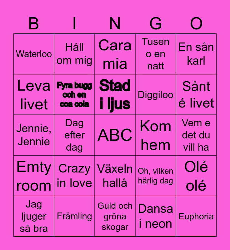 This bingo card has a free space and 24 words: Crazy in love, Främling, Stad i ljus, Jag ljuger så bra, En sån karl, Waterloo, Leva livet, Håll om mig, Kom hem, Växeln hallå, Diggiloo, Jennie, Jennie, Oh, vilken härlig dag, Olé olé, Fyra bugg och en coa cola, Dansa i neon, Vem e det du vill ha, Cara mia, Sånt é livet, Dag efter dag, Euphoria, Emty room, Tusen o en natt and Guld och gröna skogar.
