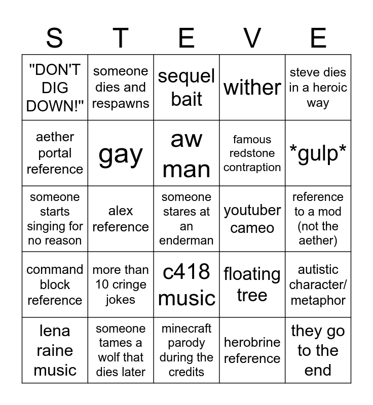 This bingo card has a free space and 24 words: more than 10 cringe jokes, someone tames a wolf that dies later, aw man, lena raine music, steve dies in a heroic way, ''DON'T DIG DOWN!'', aether portal reference, someone dies and respawns, youtuber cameo, c418 music, famous redstone contraption, someone starts singing for no reason, floating tree, autistic character/ metaphor, gay, herobrine reference, reference to a mod (not the aether), sequel bait, *gulp*, alex reference, they go to the end, command block reference, wither and minecraft parody during the credits.
