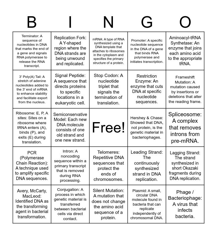 This bingo card has a free space and 81 words: Transcription: The synthesis of RNA using a DNA template., Translation: The synthesis of a polypeptide using the genetic information encoded in an mRNA molecule., mRNA: A type of RNA synthesized using a DNA template that attaches to ribosomes in the cytoplasm and specifies the primary structure of a protein., tRNA: An RNA molecule that functions as a translator between nucleic acid and protein languages by carrying specific amino acids to the ribosome., rRNA: RNA molecules that, together with proteins, make up ribosomes; the most abundant type of RNA., RNA Processing: Modification of RNA primary transcripts, including splicing out of introns, joining exons, and altering the 5' and 3' ends., Triplet Code: A genetic information system in which a set of three-nucleotide-long words specify the amino acids for polypeptide chains., Template Strand: The DNA strand that provides the pattern for ordering nucleotides in an RNA transcript., Codon: A three-nucleotide sequence of DNA or mRNA that specifies a particular amino acid or termination signal., Anticodon: A nucleotide triplet at one end of a tRNA molecule that base-pairs with a codon on an mRNA molecule., Reading Frame: On an mRNA, the triplet grouping of ribonucleotides used by the translation machinery during polypeptide synthesis., RNA Polymerase: An enzyme that links ribonucleotides into a growing RNA chain during transcription., Promoter: A specific nucleotide sequence in the DNA of a gene that binds RNA polymerase and initiates transcription., Terminator: A sequence of nucleotides in DNA that marks the end of a gene and signals RNA polymerase to release the RNA transcript., 5' cap: A modified guanine nucleotide added to the 5' end of mRNA to protect it from degradation and facilitate ribosome binding., 3' Poly(A) Tail: A stretch of adenine nucleotides added to the 3' end of mRNA to enhance stability and facilitate export from the nucleus., RNA Splicing: The removal of introns and joining of exons in an mRNA molecule., Intron: A noncoding sequence within a primary transcript that is removed during RNA processing., Exon: A coding sequence that remains in the RNA after RNA processing., Spliceosome: A complex that removes introns from pre-mRNA., Ribozyme: An RNA molecule that functions as an enzyme, such as an intron that catalyzes its own removal during RNA splicing., Aminoacyl-tRNA Synthetase: An enzyme that joins each amino acid to the appropriate tRNA., Ribosome: E, P, A sites: Sites on a ribosome where tRNA enters (A), binds (P), and exits (E) during translation., Stop Codon: A nucleotide triplet that signals the termination of translation., Signal Peptide: A sequence that directs proteins to specific locations in a eukaryotic cell., Mutation: A change in the nucleotide sequence of an organism's DNA., Point Mutation: A change in a single nucleotide pair of a gene., Base-Pair Substitution: A mutation where one base pair is replaced by another., Insertion: A mutation involving the addition of one or more nucleotide pairs to a gene., Deletion: A mutation involving the loss of one or more nucleotide pairs from a gene., Frameshift Mutation: A mutation caused by insertions or deletions that alter the reading frame., Mutagen: A chemical or physical agent that causes mutations., Silent Mutation: A mutation that does not change the amino acid sequence of a protein., Griffith Experiment: Discovered bacterial transformation by injecting mice with different strains of bacteria., Avery, McCarty, MacLeod: Identified DNA as the transforming agent in bacterial transformation., Hershey & Chase: Showed that DNA, not protein, is the genetic material in bacteriophages., Chargaff: Discovered that DNA has equal amounts of A-T and G-C base pairs., Rosalind Franklin & Maurice Wilkins: Used X-ray diffraction to determine the helical structure of DNA., Watson & Crick: Built the first accurate model of the DNA double helix., Transformation: The assimilation of external DNA by a cell, resulting in a genetic change., Phage / Bacteriophage: A virus that infects bacteria., Double Helix: The two-stranded spiral structure of DNA., Purine: A nitrogenous base with a double-ring structure (adenine and guanine)., Pyrimidine: A nitrogenous base with a single-ring structure (cytosine, thymine, and uracil)., Semiconservative Model: Each new DNA molecule consists of one old strand and one new strand., Origin of Replication: The specific site where DNA replication begins., Replication Fork: A Y-shaped region where the DNA strands are being unwound and replicated., DNA Polymerase: An enzyme that adds nucleotides to a growing DNA strand., Antiparallel: The opposite orientation of DNA strands in the double helix., 5' and 3' Ends: The directionality of DNA strands; nucleotides are added to the 3' end., Leading Strand: The continuously synthesized strand in DNA replication., Lagging Strand: The strand synthesized in short Okazaki fragments during DNA replication., Okazaki Fragments: Short DNA fragments formed on the lagging strand., DNA Ligase: An enzyme that joins Okazaki fragments by forming covalent bonds., Primer: A short RNA sequence that provides a starting point for DNA synthesis., Primase: An enzyme that synthesizes RNA primers., Helicase: An enzyme that unwinds the DNA double helix., Single-Strand Binding Protein: Proteins that stabilize single-stranded DNA during replication., Nuclease: An enzyme that removes damaged DNA segments., Nucleotide Excision Repair: A DNA repair process that removes and replaces damaged nucleotides., Telomeres: Repetitive DNA sequences that protect the ends of chromosomes., Telomerase: An enzyme that extends telomeres to prevent chromosome shortening., Operon: A genetic unit consisting of a promoter, operator, and genes regulated together., Operator: A DNA segment that acts as a switch for transcription regulation., Repressor: A protein that inhibits gene transcription by binding to the operator., 