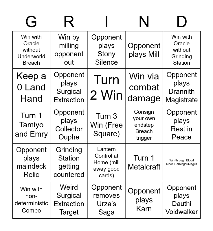 This bingo card has a free space and 24 words: Grinding Station getting countered, Weird Surgical Extraction Target, Turn 2 Win, Win with non-deterministic Combo, Win with Oracle without Grinding Station, Win with Oracle without Underworld Breach, Keep a 0 Land Hand, Win by milling opponent out, Consign your own endstep Breach trigger, Lantern Control at Home (mill away good cards), Win via combat damage, Turn 1 Tamiyo and Emry, Turn 1 Metalcraft, Win through Blood Moon/Harbinger/Magus, Opponent plays Surgical Extraction, Opponent plays Karn, Opponent plays Rest in Peace, Opponent plays Stony Silence, Opponent plays Drannith Magistrate, Opponent plays Collector Ouphe, Opponent plays Dauthi Voidwalker, Opponent plays maindeck Relic, Opponent plays Mill and Opponent removes Urza's Saga.