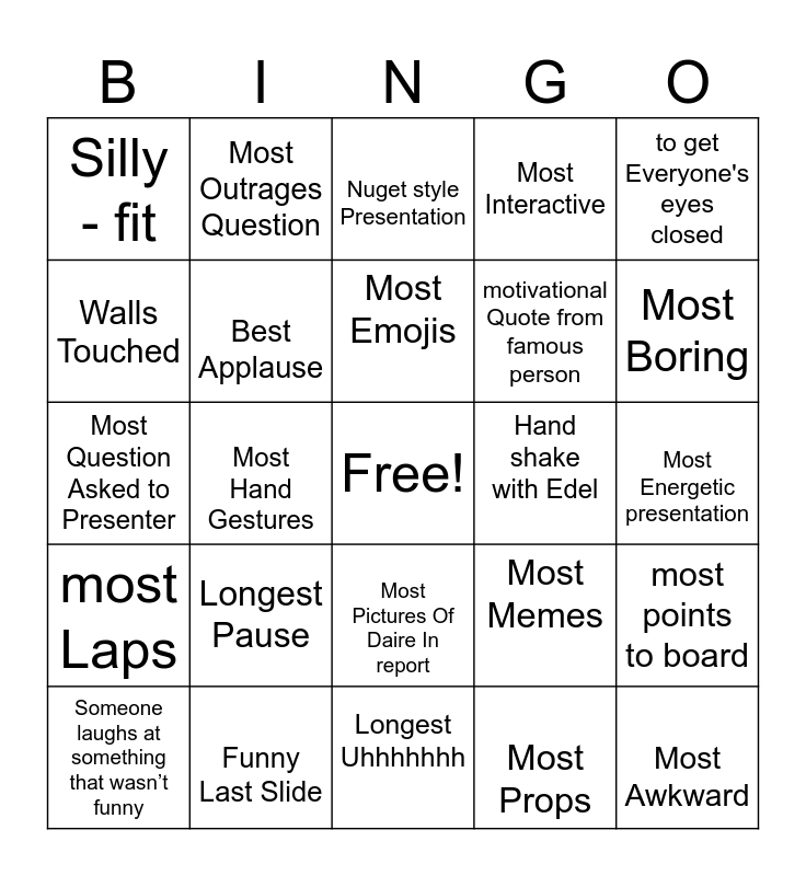 This bingo card has a free space and 24 words: Longest Pause, Funny Last Slide, Most Emojis, Someone laughs at something that wasn’t funny, to get Everyone's eyes closed, Silly - fit, Walls Touched, Most Outrages Question, Hand shake with Edel, Most Pictures Of Daire In report, motivational Quote from famous person, Most Question Asked to Presenter, Most Memes, most points to board, Best Applause, Most Props, Most Energetic presentation, Nuget style Presentation, Most Boring, Most Hand Gestures, Most Awkward, most Laps, Most Interactive and Longest Uhhhhhhh.