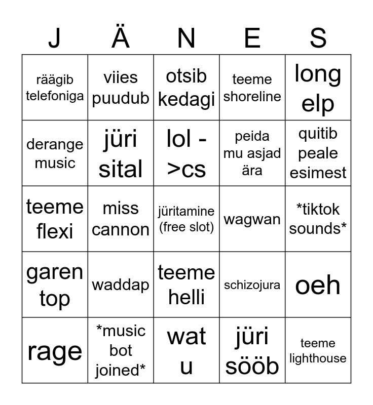 This bingo card has a free space and 32 words: jüri sööb, teemo vastas, miss cannon, support troll, garen top, jüri sital, long elp, oeh, viies puudub, teeme tarkovi, lol ->cs, otsib kedagi, ragequit, teeme csi, wagwan, kebab, rage, teeme flexi, teeme helli, waddap, schizojura, jüri cope, *tiktok sounds*, *music bot joined*, teeme lighthouse, teeme shoreline, peida mu asjad ära, derange music, räägib telefoniga, wat u, tehke striimi and quitib peale esimest.