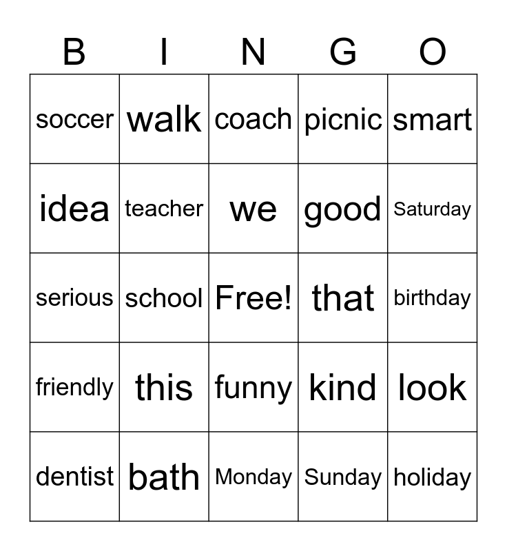 This bingo card has a free space and 29 words: dentist, doctor, school, bus, soccer, coach, teacher, this, that, bath, birthday, holiday, Monday, Sunday, Saturday, play, funny, friendly, smart, serious, kind, very, good, idea, picnic, walk, look, we and the.