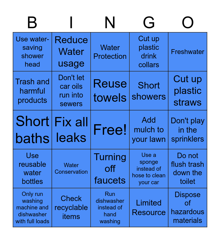 This bingo card has a free space and 24 words: Water Conservation, Check recyclable items, Reuse towels, Only run washing machine and dishwasher with full loads, Freshwater, Use water-saving shower head, Trash and harmful products, Reduce Water usage, Add mulch to your lawn, Turning off faucets, Short showers, Short baths, Use a sponge instead of hose to clean your car, Do not flush trash down the toilet, Don't let car oils run into sewers, Limited Resource, Don't play in the sprinklers, Water Protection, Cut up plastic straws, Fix all leaks, Dispose of hazardous materials, Use reusable water bottles, Cut up plastic drink collars and Run dishwasher instead of hand washing.