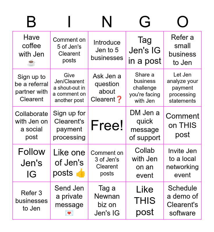 This bingo card has a free space and 24 words: Like one of Jen's posts 👍, Send Jen a private message 💌, Ask Jen a question about Clearent❓, Refer 3 businesses to Jen, Refer a small business to Jen, Have coffee with Jen ☕️, Sign up to be a referral partner with Clearent, Comment on 5 of Jen's Clearent posts, DM Jen a quick message of support, Comment on 3 of Jen's Clearent posts, Share a business challenge you're facing with Jen, Collaborate with Jen on a social post, Collab with Jen on an event, Invite Jen to a local networking event, Give Jen/Clearent a shout-out in a comment on another post, Like THIS post, Comment on THIS post, Introduce Jen to 5 businesses, Let Jen analyze your payment processing statements, Sign up for Clearent's payment processing, Schedule a demo of Clearent's software, Follow Jen's IG, Tag Jen's IG in a post and Tag a Newnan biz on Jen's IG.