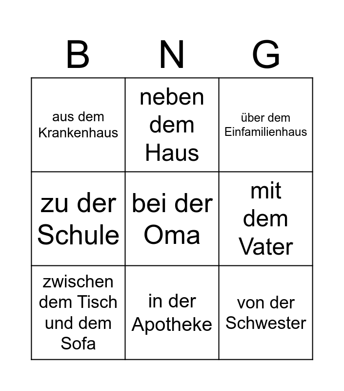 This bingo card has a free space and 8 words: mit dem Vater, über dem Einfamilienhaus, neben dem Haus, zwischen dem Tisch und dem Sofa, aus dem Krankenhaus, von der Schwester, zu der Schule and in der Apotheke.