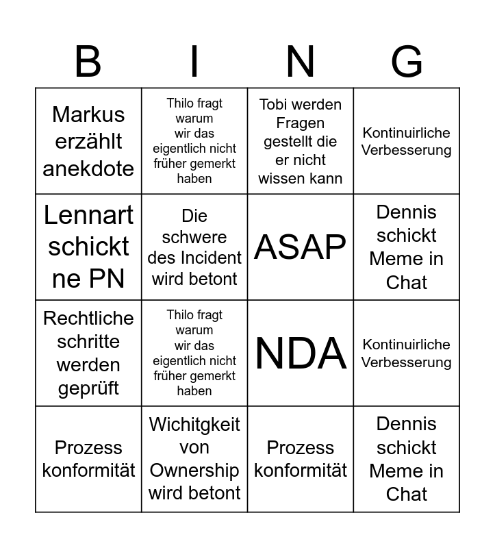This bingo card has 22 words: Wichitgkeit von Ownership wird betont, Jörg schweift ab, Thilo fragt warum wir das eigentlich nicht früher gemerkt haben, Dirk shootet gegen Thilo, Die schwere des Incident wird betont, ASAP, Markus erzählt anekdote, Tobi werden Fragen gestellt die er nicht wissen kann, NDA, Dennis schickt Meme in Chat, Rechtliche schritte werden geprüft, Kontinuirliche Verbesserung, Wir halten Rücksprache mit unseren Rechtsberatern., Lennart schickt ne PN, Prozess konformität, Incident Responsetime, Kontinuirliche Verbesserung, Prozess konformität, Thilo fragt warum wir das eigentlich nicht früher gemerkt haben, Lennart schickt ne PN, Dennis schickt Meme in Chat and NDA.
