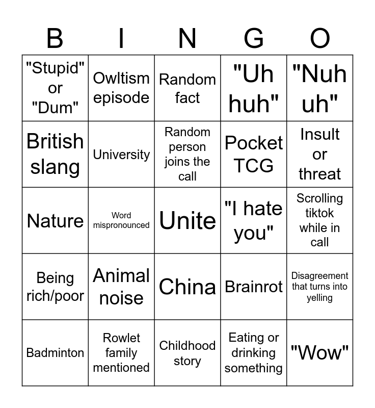 This bingo card has a free space and 24 words: Animal noise, Rowlet family mentioned, Random person joins the call, Badminton, "Nuh uh", "Stupid" or "Dum", British slang, Owltism episode, "I hate you", China, Pocket TCG, Nature, Brainrot, Disagreement that turns into yelling, University, Eating or drinking something, Scrolling tiktok while in call, Random fact, Insult or threat, Word mispronounced, "Wow", Being rich/poor, "Uh huh" and Childhood story.