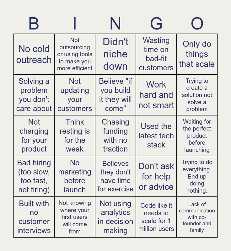 This bingo card has a free space and 24 words: Built with no customer interviews, No marketing before launch, Believe "if you build it they will come", Code like it needs to scale for 1 million users, Only do things that scale, No cold outreach, Not outsourcing or using tools to make you more efficient, Didn't niche down, Used the latest tech stack, Waiting for the perfect product before launching, Not charging for your product, Not updating your customers, Don't ask for help or advice, Trying to do everything. End up doing nothing., Solving a problem you don't care about, Not knowing where your first users will come from, Not using analytics in decision making, Wasting time on bad-fit customers, Trying to create a solution not solve a problem, Bad hiring (too slow, too fast, not firing), Think resting is for the weak, Believes they don't have time for exercise, Work hard and not smart and Lack of communication with co-founder and family.