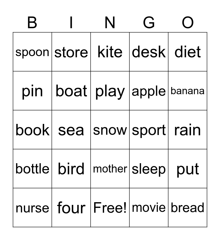 This bingo card has 31 words: Free!, photo, sea, sauce, spoon, kite, boat, sleep, sport, movie, rain, snow, bread, button, banana, lemon, put, bird, bottle, mother, diet, oil, nurse, store, apple, pin, desk, book, four, play and they.