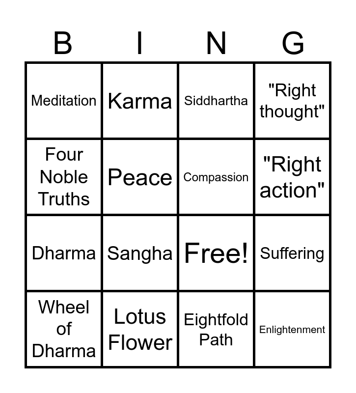 This bingo card has 19 words: Free!, Buddha, Siddhartha, Enlightenment, Suffering, Four Noble Truths, Eightfold Path, Meditation, Karma, Dharma, Sangha, Peace, Compassion, Lotus Flower, Wheel of Dharma, "Life has suffering", "Right thought", "Right action" and "Find inner peace".