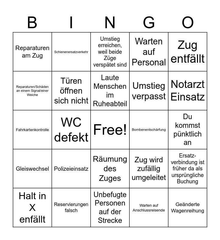 This bingo card has a free space and 25 words: Polizeieinsatz, Unbefugte Personen auf der Strecke, Laute Menschen im Ruheabteil, Halt in X enfällt, Zug entfällt, Reparaturen am Zug, Reparaturen/Schäden an einem Signal/einer Weiche, Schienenersatzverkehr, Bombenentschärfung, Räumung des Zuges, Umstieg verpasst, Fahrkartenkontrolle, Zug wird zufällig umgeleitet, Ersatz-verbindung ist früher da als ursprüngliche Buchung, Türen öffnen sich nicht, Streik, Du kommst pünktlich an, Umstieg erreichen, weil beide Züge verspätet sind, Notarzt Einsatz, WC defekt, Geänderte Wagenreihung, Reservierungen falsch, Gleiswechsel, Warten auf Personal and Warten auf Anschlussreisende.