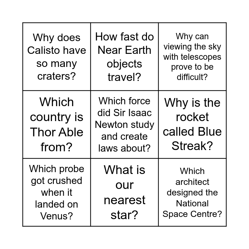 This bingo card has a free space and 8 words: Why is the rocket called Blue Streak?, Why can viewing the sky with telescopes prove to be difficult?, How fast do Near Earth objects travel?, Which probe got crushed when it landed on Venus?, Why does Calisto have so many craters?, Which architect designed the National Space Centre?, Which country is Thor Able from? and What is our nearest star?.