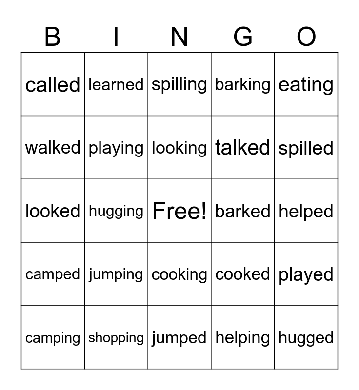 This bingo card has a free space and 24 words: jumping, shopping, looking, camping, eating, called, walked, learned, barked, cooking, talked, looked, cooked, played, playing, helping, helped, spilling, spilled, hugging, hugged, camped, barking and jumped.