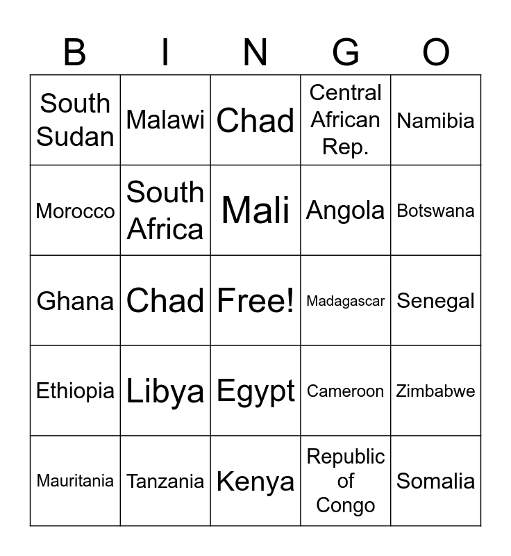This bingo card has a free space and 24 words: Libya, Tanzania, Mali, Mauritania, Namibia, South Sudan, Morocco, Malawi, Madagascar, Egypt, Angola, Ghana, Cameroon, Zimbabwe, South Africa, Republic of Congo, Senegal, Chad, Botswana, Chad, Somalia, Ethiopia, Central African Rep. and Kenya.