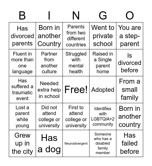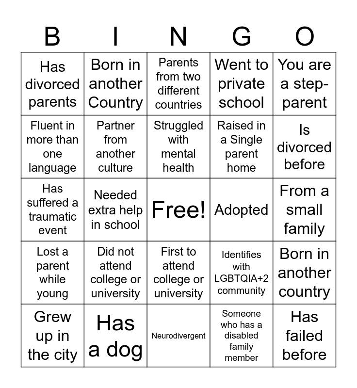 This bingo card has a free space and 24 words: Did not attend college or university, Has a dog, Struggled with mental health, Grew up in the city, You are a step-parent, Has divorced parents, Fluent in more than one language, Born in another Country, Adopted, First to attend college or university, Raised in a Single parent home, Has suffered a traumatic event, Identifies with LGBTQIA+2 community, Born in another country, Partner from another culture, Someone who has a disabled family member, From a small family, Parents from two different countries, Is divorced before, Needed extra help in school, Has failed before, Lost a parent while young, Went to private school and Neurodivergent.