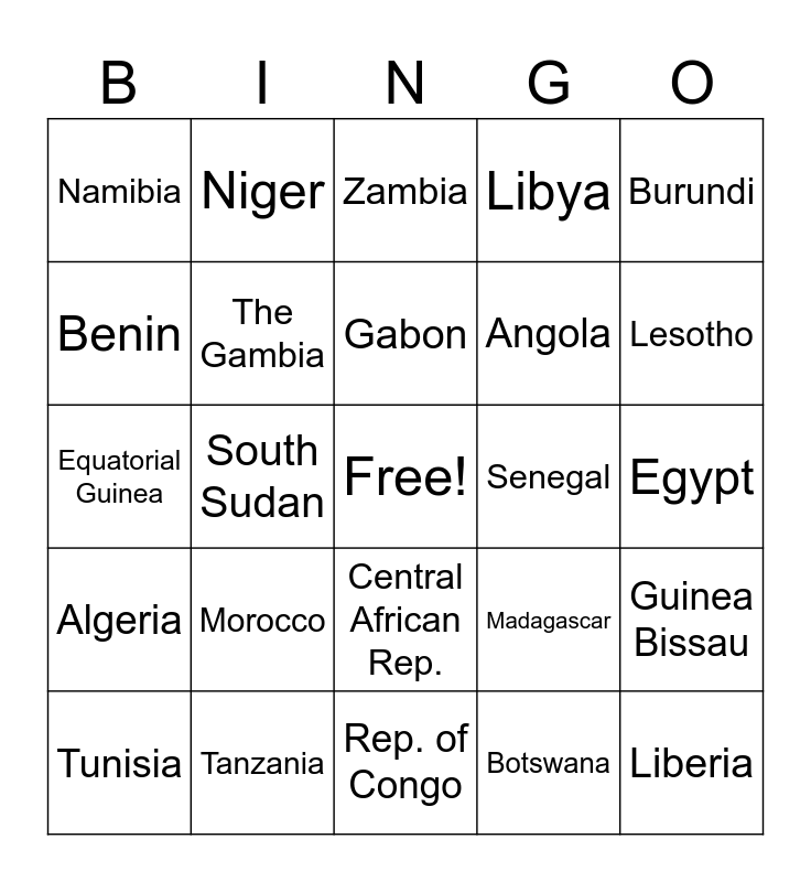 This bingo card has a free space and 24 words: Morocco, Tanzania, Gabon, Tunisia, Burundi, Namibia, Benin, Niger, Senegal, Central African Rep., Angola, Equatorial Guinea, Madagascar, Guinea Bissau, The Gambia, Botswana, Egypt, Zambia, Lesotho, South Sudan, Liberia, Algeria, Libya and Rep. of Congo.