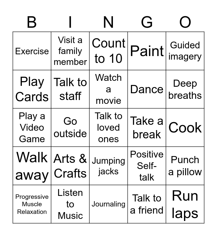 This bingo card has a free space and 24 words: Arts & Crafts, Listen to Music, Watch a movie, Progressive Muscle Relaxation, Guided imagery, Exercise, Play Cards, Visit a family member, Take a break, Jumping jacks, Dance, Play a Video Game, Positive Self-talk, Punch a pillow, Talk to staff, Talk to a friend, Cook, Count to 10, Deep breaths, Go outside, Run laps, Walk away, Paint and Journaling.