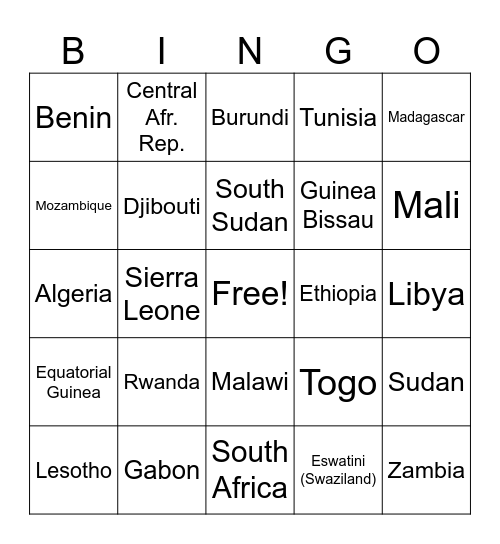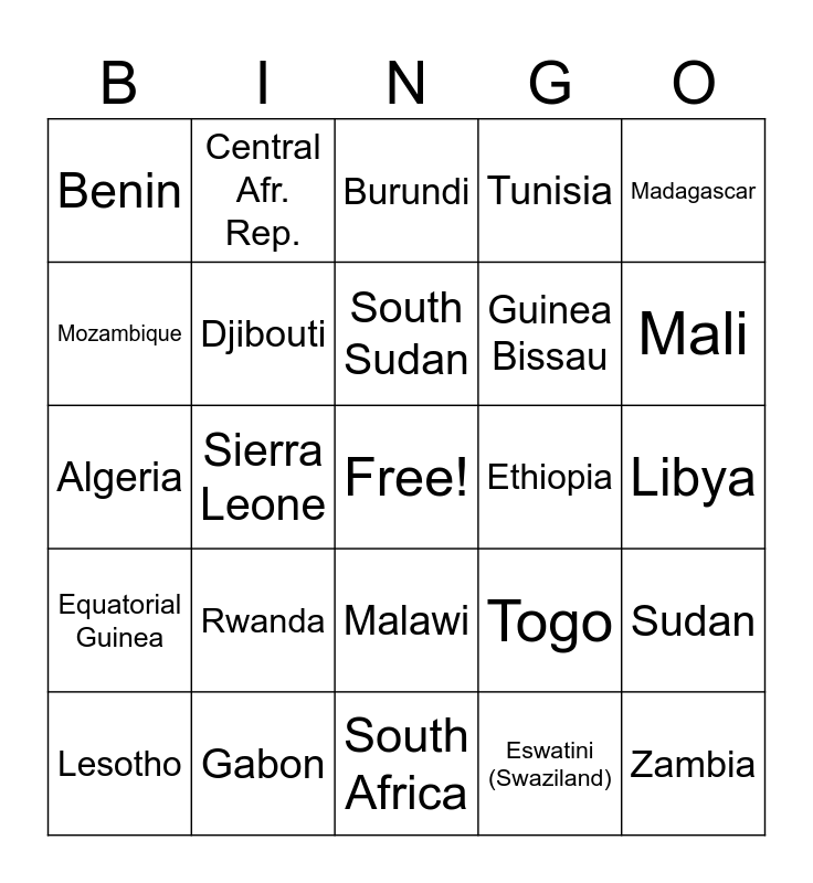 This bingo card has a free space and 24 words: Rwanda, Gabon, South Sudan, Lesotho, Madagascar, Benin, Mozambique, Central Afr. Rep., Ethiopia, Malawi, Guinea Bissau, Algeria, Togo, Sudan, Djibouti, Eswatini (Swaziland), Libya, Burundi, Mali, Sierra Leone, Zambia, Equatorial Guinea, Tunisia and South Africa.