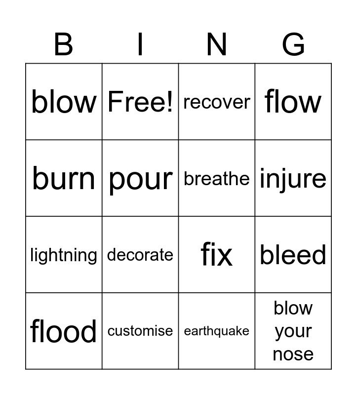 This bingo card has 33 words: ache, beat, bleed, blink, blow your nose, breathe, burn, cough, Free!, cut, injure, recover, yawn, create, customise, decorate, design, fix, mend, rebuild, recycle, sew, blow, earthquake, fall down, flood, flow, lightning, pour, rise, shake, snowstorm and tornado.