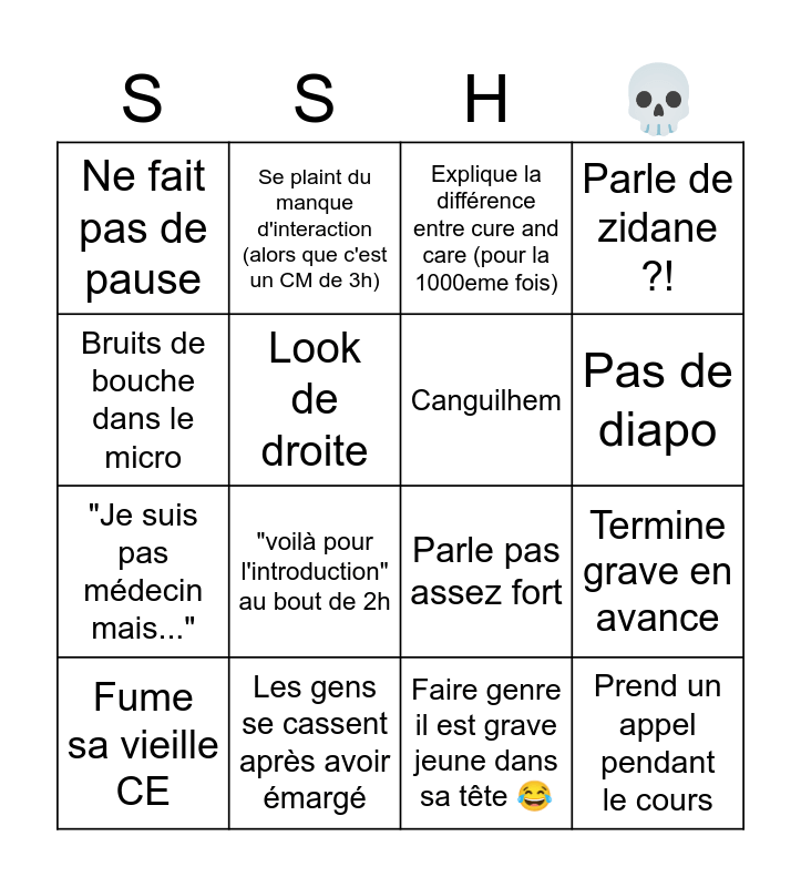 This bingo card has 16 words: Les gens se cassent après avoir émargé, Termine grave en avance, Explique la différence entre cure and care (pour la 1000eme fois), Ne fait pas de pause, "Je suis pas médecin mais...", Se plaint du manque d'interaction (alors que c'est un CM de 3h), Parle pas assez fort, Faire genre il est grave jeune dans sa tête 😂, Bruits de bouche dans le micro, Look de droite, Fume sa vieille CE, Parle de zidane ?!, "voilà pour l'introduction" au bout de 2h, Pas de diapo, Canguilhem and Prend un appel pendant le cours.