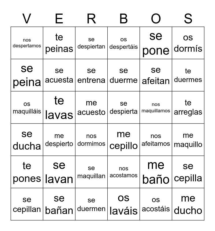 This bingo card has 91 words: Free!, me arreglo, te arreglas, se arregla, nos arreglamos, os arregláis, se arreglan, me baño, te bañas, se baña, nos bañamos, os bañáis, se bañan, me acuesto, te acuestas, se acuesta, nos acostamos, os acostáis, se acuestan, me afeito, te afeitas, se afeita, nos afeitamos, os afeitáis, se afeitan, me cepillo, te cepillas, se cepilla, nos cepillamos, os cepilláis, se cepillan, me despierto, te despiertas, se despierta, nos despertamos, os despertáis, se despiertan, me duermo, te duermes, se duerme, nos dormimos, os dormís, se duermen, me ducho, te duchas, se ducha, nos duchamos, os ducháis, se duchan, me entreno, te entrenas, se entrena, nos entrenamos, os entrenáis, se entrenan, me lavo, te lavas, se lava, nos lavamos, os laváis, se lavan, me levanto, te levantas, se levanta, nos levantamos, os levantáis, se levantan, me maquillo, te maquillas, se maquilla, nos maquillamos, os maquilláis, se maquillan, me peino, te peinas, se peina, nos peinamos, os peináis, se peinan, me pongo, te pones, se pone, nos ponemos, os ponéis, se ponen, me seco, te secas, se seca, nos secamos, os secáis and se secan.