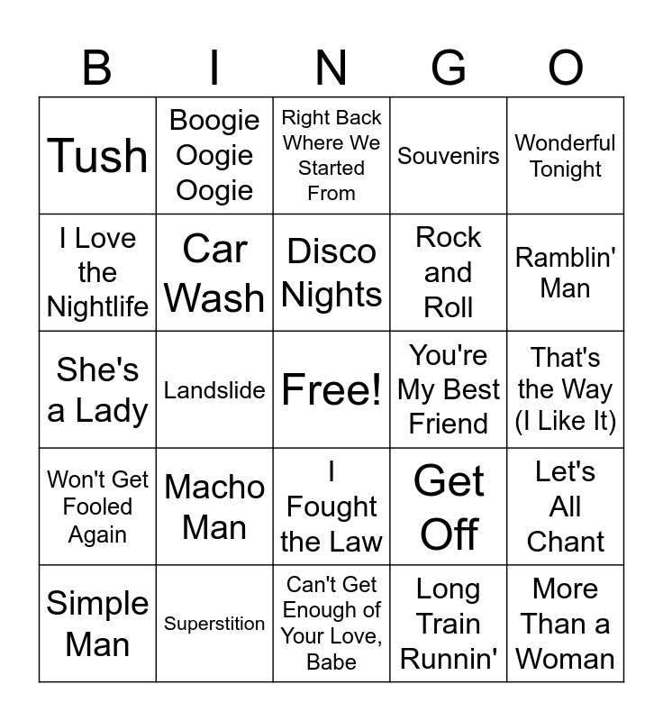 This bingo card has a free space and 47 words: Brick House, More Than a Woman, Shake Your Body (Down to the Ground), Can't Get Enough of Your Love, Babe, Macho Man, Boogie Nights, Boogie Oogie Oogie, Everybody Dance, I Love the Nightlife, Rapper's Delight, Car Wash, Souvenirs, Let's All Chant, Get Off, Mandalay, Knock Me Out, Disco Nights, You're My Best Friend, All Right Now, Wonderful Tonight, Landslide, Long Train Runnin', Tush, Rock and Roll, So Lonely, Ramblin' Man, Simple Man, War Pigs, I Fought the Law, Won't Get Fooled Again, Saturday Night's Alright (For Fighting), We Are the Champions, I Will Survive, Disco Inferno, We Are Family, Superstition, That's the Way (I Like It), Le Freak, Kung Fu Fighting, Grease, Waterloo, Right Back Where We Started From, She's a Lady, Signed, Sealed, Delivered I'm Yours, Daddy Cool, Smoke on the Water and War.