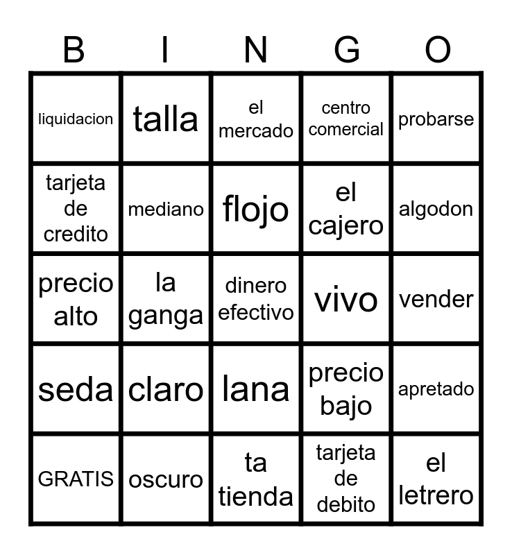 This bingo card has 29 words: GRATIS, la entrada, la ganga, el letrero, liquidacion, el mercado, mediano, claro, vivo, oscuro, vender, dinero efectivo, ta tienda, tarjeta de debito, algodon, cuero, lana, seda, probarse, precio alto, precio bajo, la caja, el cajero, tarjeta de credito, centro comercial, talla, apretado, flojo and comprar.