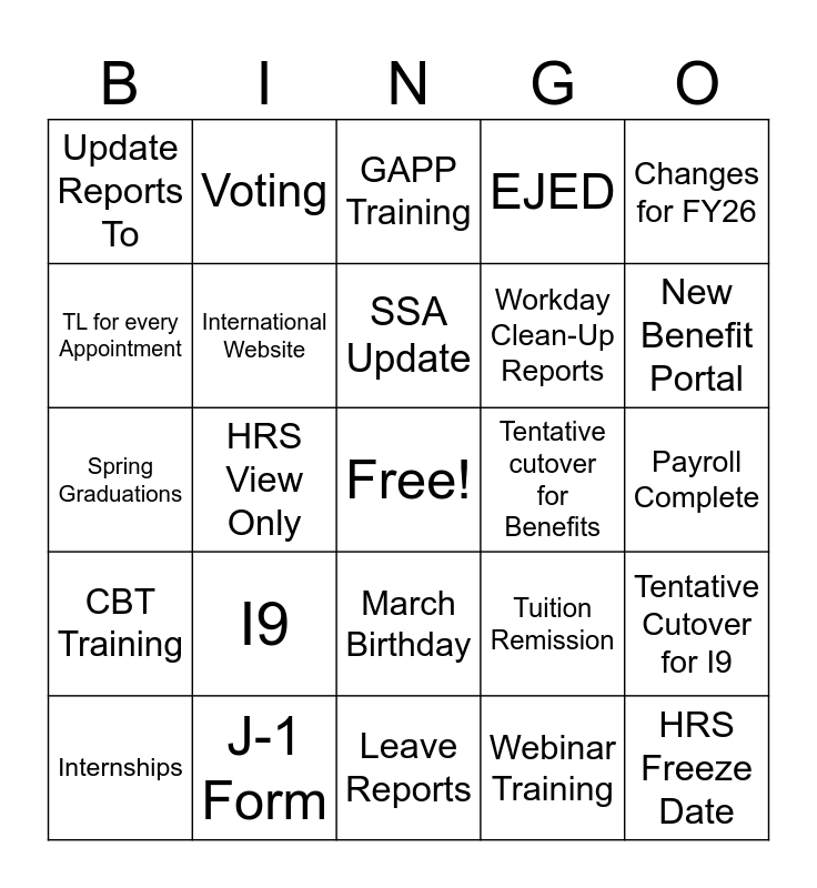 This bingo card has a free space and 28 words: Tentative Cutover for I9, Summer Appointments, Workday Clean-Up Reports, Webinar Training, TL for every Appointment, GAPP Training, Voting, CBT Training, Tentative cutover for Benefits, Internships, Spring Graduations, EJED, J-1 Form, Leave Reports, New Benefit Portal, HRS Outage, I9, International Website, SSA Update, March Birthday, Update Reports To, NSR, HRS Freeze Date, HRS View Only, Payroll Complete, Tuition Remission, Changes for FY26 and Immigration.