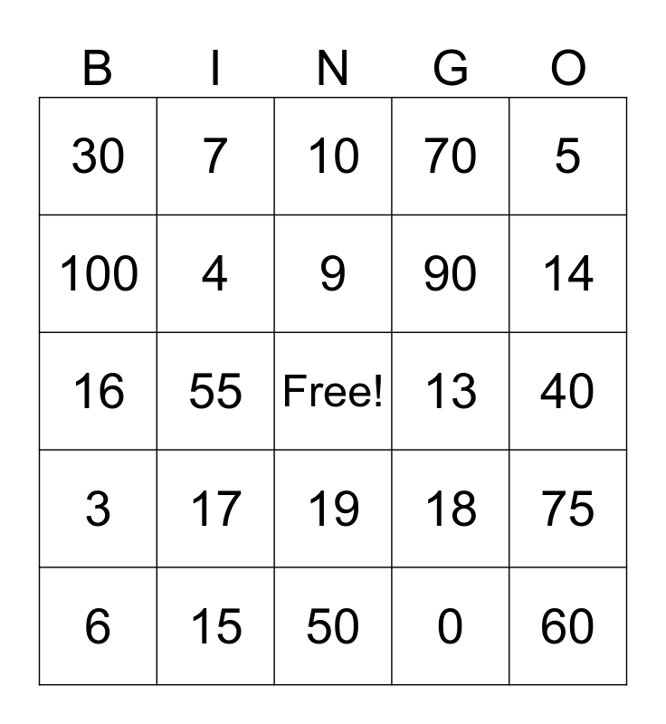 This bingo card has a free space and 34 words: Numeros, 0, 1, 2, 3, 4, 5, 6, 7, 8, 9, 10, 11, 12, 13, 14, 15, 16, 17, 18, 19, 20, 30, 40, 50, 60, 70, 80, 90, 100, 45, 55, 75 and 35.