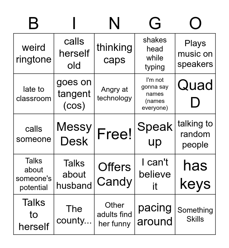 This bingo card has a free space and 24 words: Talks about husband, The county..., Angry at technology, Talks to herself, Plays music on speakers, weird ringtone, late to classroom, calls herself old, Speak up, Offers Candy, I'm not gonna say names (names everyone), calls someone, I can't believe it, has keys, goes on tangent (cos), pacing around, talking to random people, thinking caps, Quad D, Messy Desk, Something Skills, Talks about someone's potential, shakes head while typing and Other adults find her funny.
