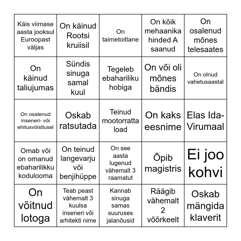 This bingo card has 31 words: Kannab sinuga samas suuruses jalanõusid, Õpib Lennuakadeemias, Oskab ratsutada, Meeldib Star Wars, Käis viimase aasta jooksul Euroopast väljas, On taimetoitlane, Sündis sinuga samal kuul, Õpib magistris, On kaks eesnime, Räägib vähemalt 2 võõrkeelt, Elas Ida- Virumaal, Teinud mootorratta load, Oskab mängida klaverit, Sõi hommikuks putru, On olnud vahetusaastal, On mõne seltsi juhatuses, Ei joo kohvi, On teinud langevarju või benjihüppe, Omab või on omanud ebaharilikku kodulooma, On see aasta lugenud vähemalt 3 raamatut, On osalenud mõnes telesaates, Pole kunagi luud murdnud, On võitnud lotoga, On käinud Rootsi kruiisil, On või oli mõnes bändis, On käinud taliujumas, On kõik mehaanika hinded A saanud, On osalenud inseneri- või ehitusvõistlusel, Teab peast vähemalt 3 kuulsa inseneri või arhitekti nime, Tegeleb ebahariliku hobiga and Kannab täna roosat.