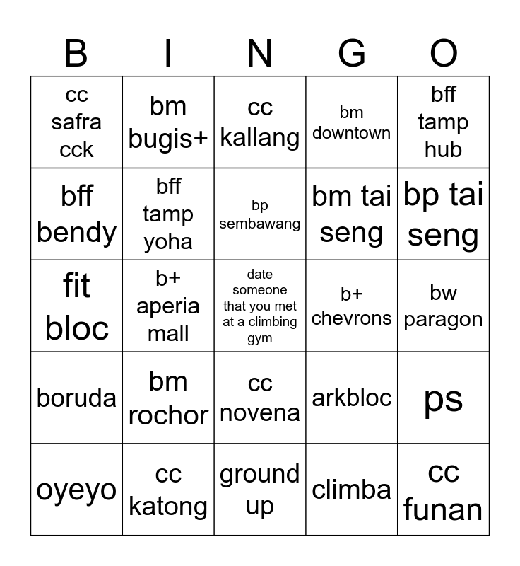 This bingo card has a free space and 24 words: bm rochor, cc katong, bp sembawang, oyeyo, bff tamp hub, cc safra cck, bff bendy, bm bugis+, b+ chevrons, cc novena, bm tai seng, fit bloc, arkbloc, ps, bff tamp yoha, climba, bw paragon, cc kallang, bp tai seng, b+ aperia mall, cc funan, boruda, bm downtown and ground up.