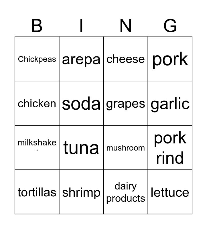 This bingo card has 36 words: vegetables, pineapple, blueberries, grapes, broccoli, lettuce, garlic, onions, chicken, beef, pork rind, pork, salmon, shrimp, tuna, Chickpeas, lentils, corn, tortillas, cheese, dairy products, sushi, croissant, BBQ ribs, tacos, arepa, mushroom, tea, milkshake ´, soda, gummy bears, tequila, sparkling water, still water, m&m's and lollipops.