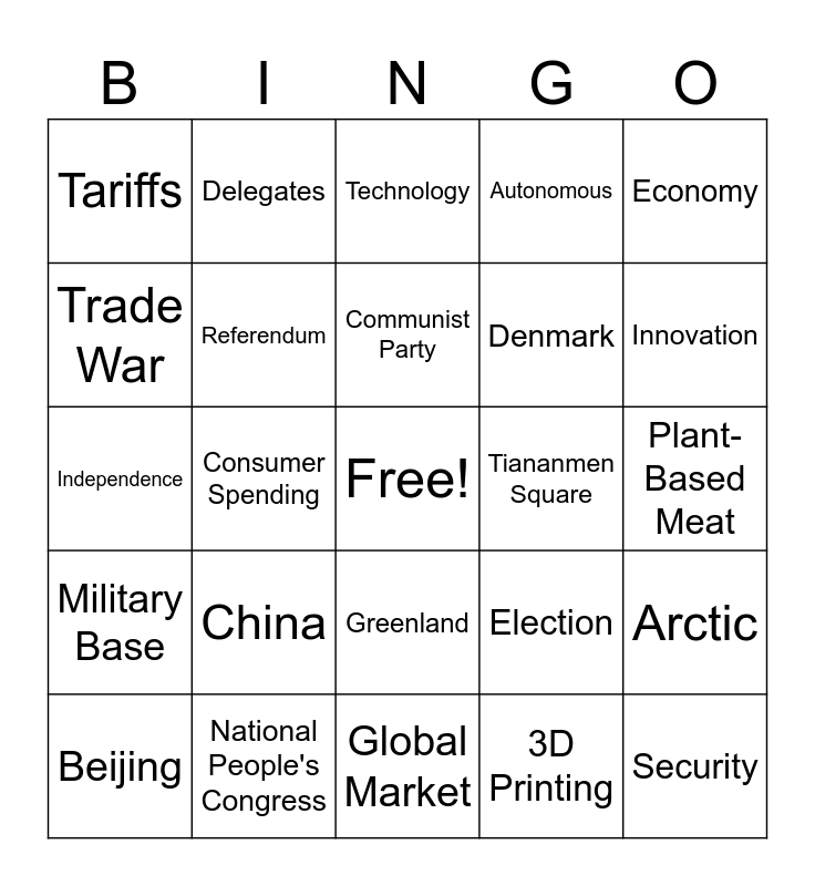 This bingo card has a free space and 24 words: China, National People's Congress, Communist Party, Beijing, Economy, Tariffs, Trade War, Delegates, Tiananmen Square, Greenland, Denmark, Independence, Election, Arctic, Referendum, 3D Printing, Plant-Based Meat, Technology, Innovation, Consumer Spending, Security, Military Base, Autonomous and Global Market.