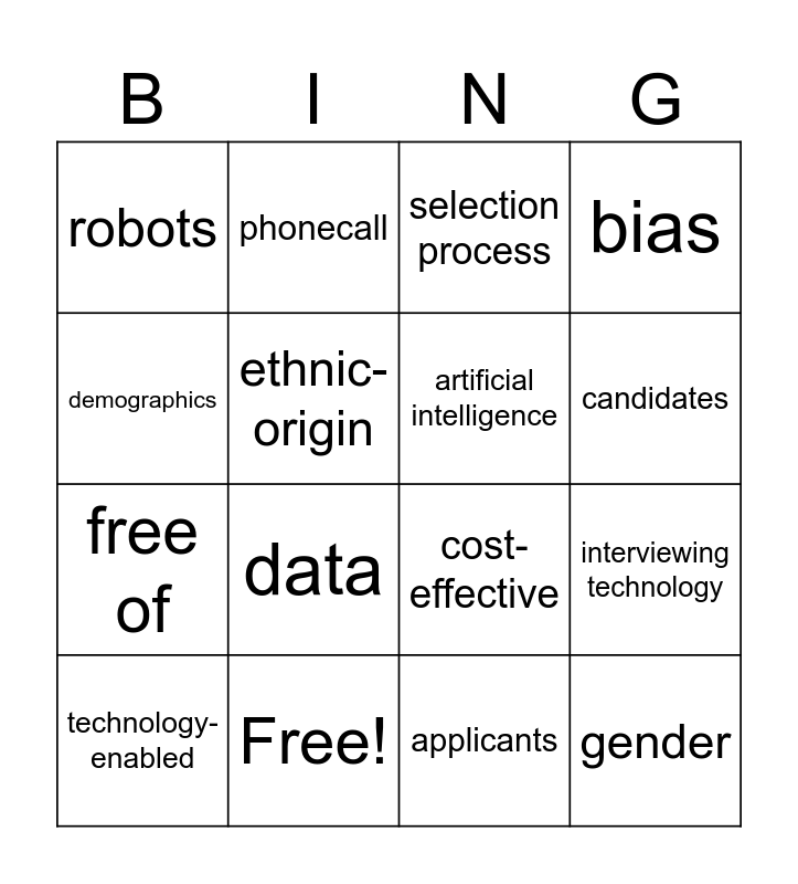 This bingo card has 21 words: Free!, applied, phonecall, interviews, applicants, artificial intelligence, robots, selection process, cost-effective, candidates, free of, bias, gender, age, ethnic-origin, stereotypes, technology-enabled, data, demographics, interviewing technology and hiring.