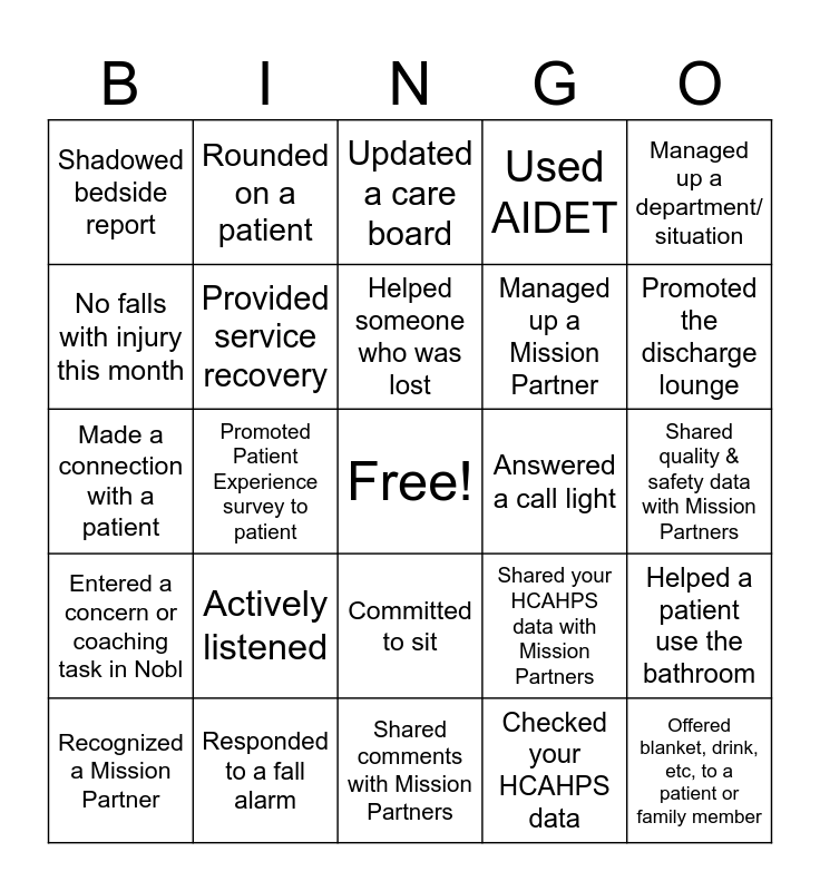 This bingo card has a free space and 24 words: Actively listened, Responded to a fall alarm, Helped someone who was lost, Recognized a Mission Partner, Managed up a department/ situation, Shadowed bedside report, No falls with injury this month, Rounded on a patient, Answered a call light, Committed to sit, Managed up a Mission Partner, Made a connection with a patient, Shared your HCAHPS data with Mission Partners, Helped a patient use the bathroom, Provided service recovery, Checked your HCAHPS data, Shared quality & safety data with Mission Partners, Updated a care board, Promoted the discharge lounge, Promoted Patient Experience survey to patient, Offered blanket, drink, etc, to a patient or family member, Entered a concern or coaching task in Nobl, Used AIDET and Shared comments with Mission Partners.