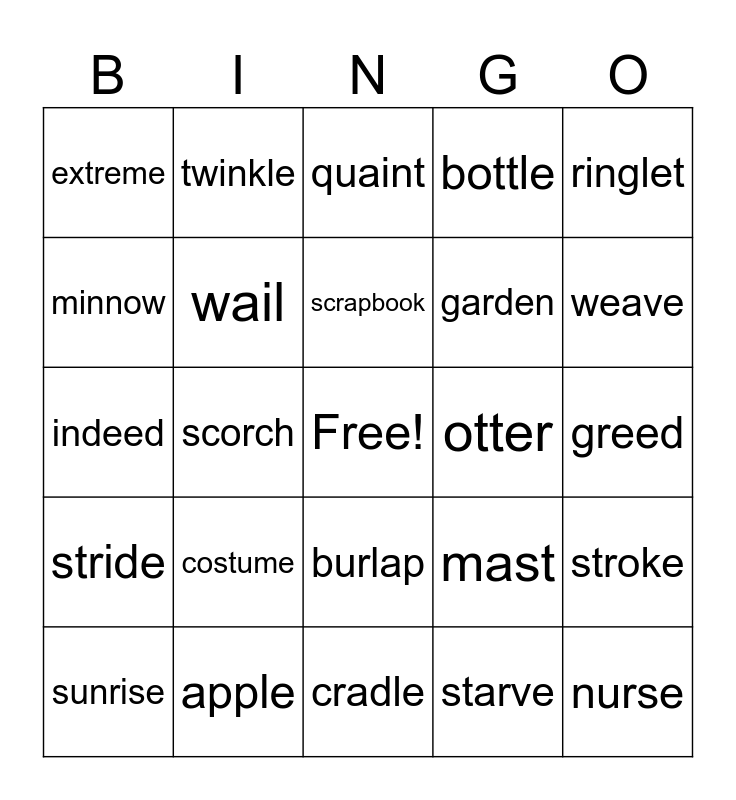 This bingo card has a free space and 24 words: costume, apple, scrapbook, sunrise, ringlet, extreme, minnow, twinkle, otter, burlap, garden, indeed, mast, stroke, wail, starve, greed, quaint, weave, scorch, nurse, stride, bottle and cradle.