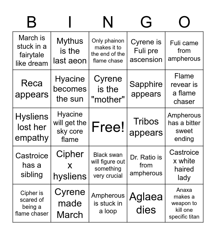 This bingo card has a free space and 24 words: Cipher x hysliens, Cyrene made March, Cyrene is the "mother", Cipher is scared of being a flame chaser, Fuli came from ampherous, March is stuck in a fairytale like dream, Reca appears, Mythus is the last aeon, Tribos appears, Black swan will figure out something very crucial, Sapphire appears, Hysliens lost her empathy, Dr. Ratio is from ampherous, Castroice x white haired lady, Hyacine becomes the sun, Aglaea dies, Ampherous has a bitter sweet ending, Only phainon makes it to the end of the flame chase, Flame revear is a flame chaser, Hyacine will get the sky core flame, Anaxa makes a weapon to kill one specific titan, Castroice has a sibling, Cyrene is Fuli pre ascension and Ampherous is stuck in a loop.